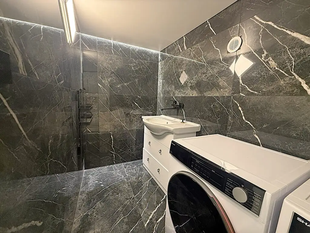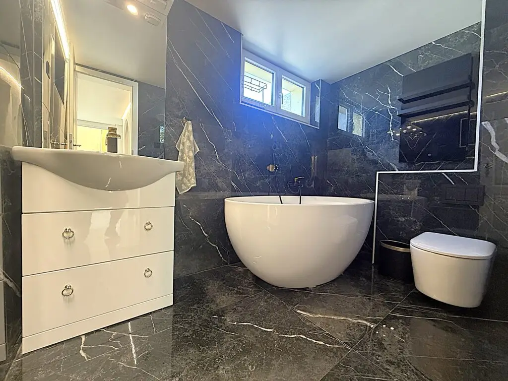 - 2 salles de bains et une buanderie : Dont une avec baignoire moderne, carrelage en marbre et grandes fenêtres. La buanderie peut être transformée avec un wc pour le rez de chaussée