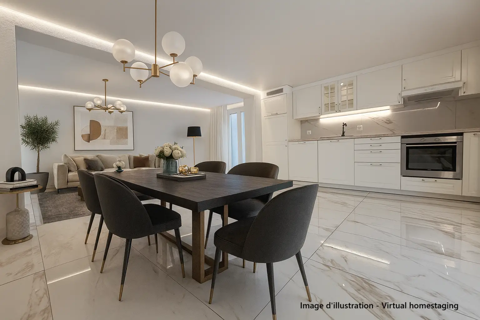 - Cuisine moderne : Entièrement équipée avec placards blancs intégrés, lave-vaisselle et finitions contemporaines